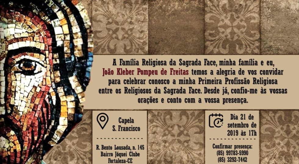 La Famiglia religiosa del Santo Volto, mia famiglia ed io, João Kleber Pompeu de Freitas abbiamo la gioia di invitarvi alla mia professione religiosa tra i Fratelli del Santo Volto. Mi affido alle vostre preghiere.