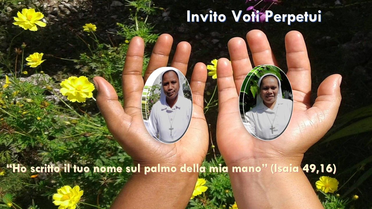 Le Religiose del Santo Volto, presenti in Indonesia, invitano tutte le sorelle e i fratelli della Congregazione, ad unirsi alla gioia di Sr. M. Merilina Tuwa e di Sr. Lusia Afrida le quali, dopo il cammno di discernimento, pronunceranno il loro "sì" libero e totale a Dio con i Voti Perpetui.