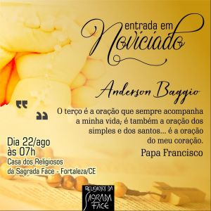 No dia 22 de agosto, o jovem Anderson Baggio (no Brasil) faz a sua entrada no noviciado, na capela de Fortaleza - comunidade dos Irmãos da Sagrada Face. (ISF)