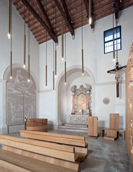 La nuova organizzazione dell’arredo coniuga le esigenze della liturgia a quelle della devozione dedicate all’urna della beata. Il linguaggio minimale dei fuochi liturgici cerca volutamente un contrappunto; l’essenzialità delle forme realizzate con un unico materiale si immergono nell’architettura del passato, lasciando al fruitore la libertà di ricercare un nuovo rapporto con il sacro, attraverso il significato simbolico e teologico che ognuno di questi oggetti porta con sé, in una successione tra passato e contemporaneo.