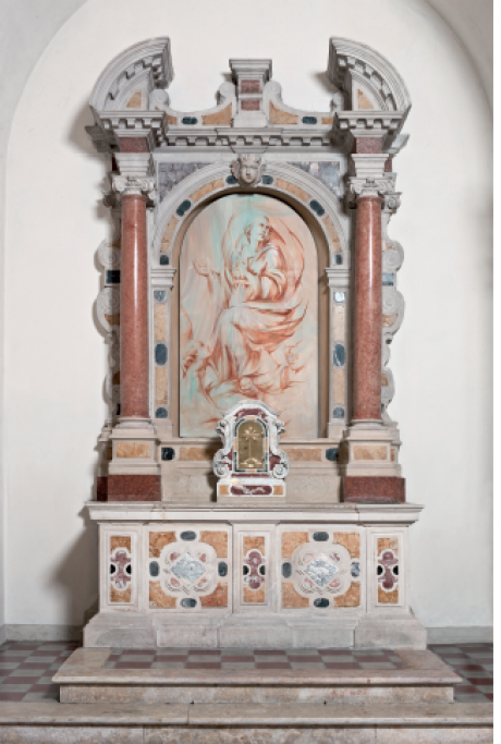 Sorretta da due angeli sorpresi e compiaciuti la Vergine sale verso l’alto dei cieli lievissima (in corpo e anima): lo sguardo beato, rivolto aldilà del limite imposto dalla tela, suggerisce che lassù il Padre l’accoglie. Poche, rapide e sicure pennellate color seppia definiscono sguardi, espressioni e sentimenti su di una preparazione a velature monocromatiche chiare che ne è la luce. La figura della Vergine al centro della pala è colonna portante nella rappresentazione come la fede per chi crede, come lo sono le colonne per l’architettura del dossale, non a caso rappresentata con la medesima cromia.