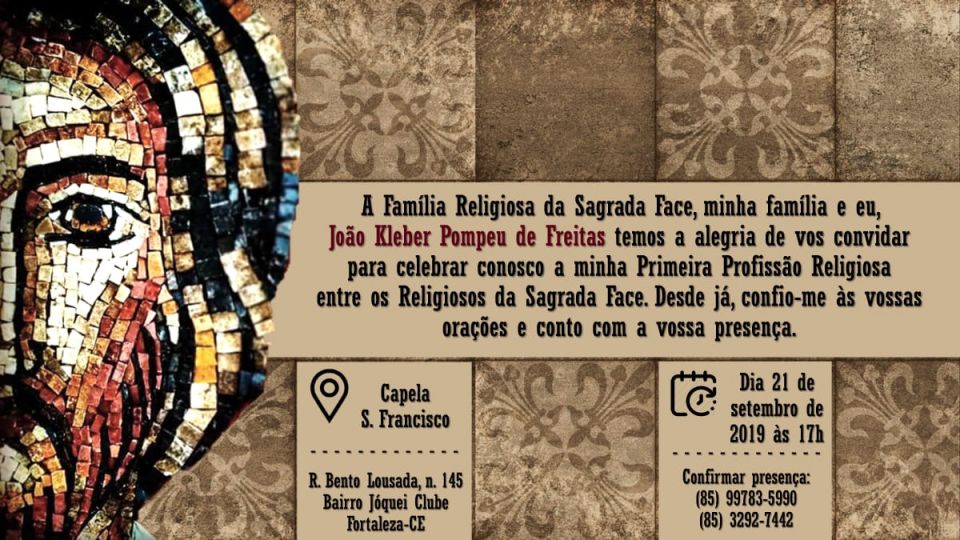 A Familia Religiosa da Sagrada Face, minha familia e eu, João Kleber Pompeu de Freitas temos a alegria de vos convidar para celebrar conosco a minha Profissão Religiosa, entre os Religiosos da Sagrada Face. Desde já, confio-me às vossas orações e conto com a vossa presença.